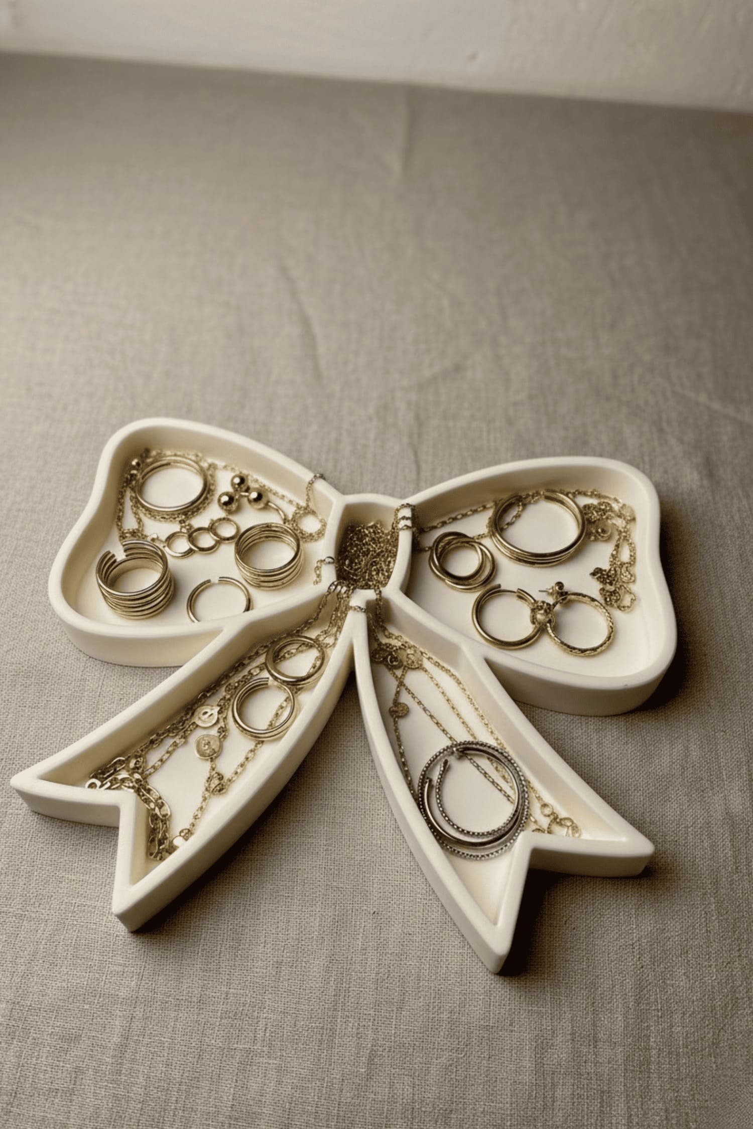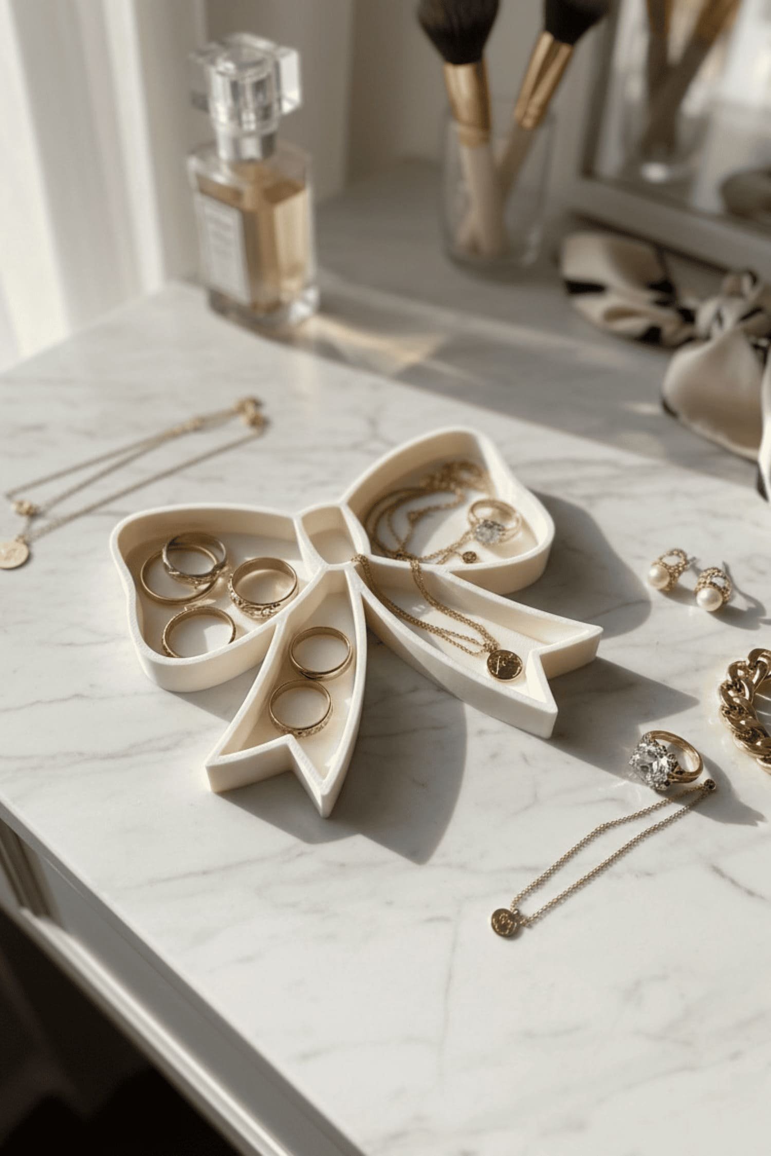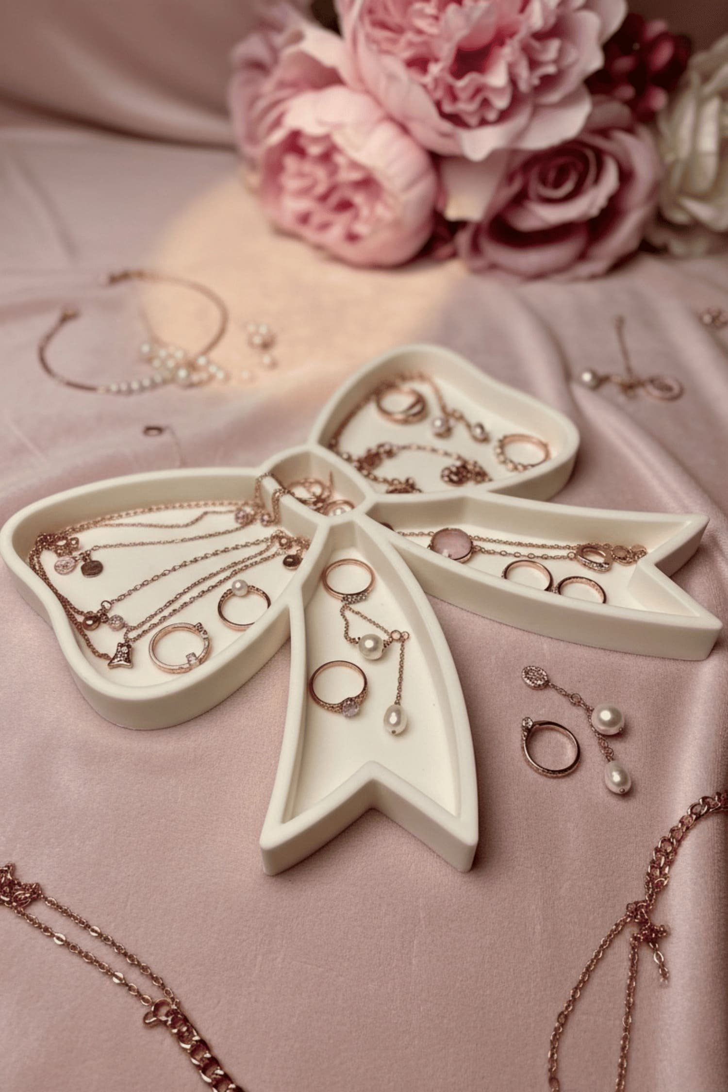 Stojalo za nakit v obliki pentlje združuje nežnost in organiziranost v enem kosu. Njegova oblika deluje igrivo in prefinjeno hkrati, zato ni le prostor za shranjevanje, temveč tudi čudovit poudarek na toaletni mizici ali polici.