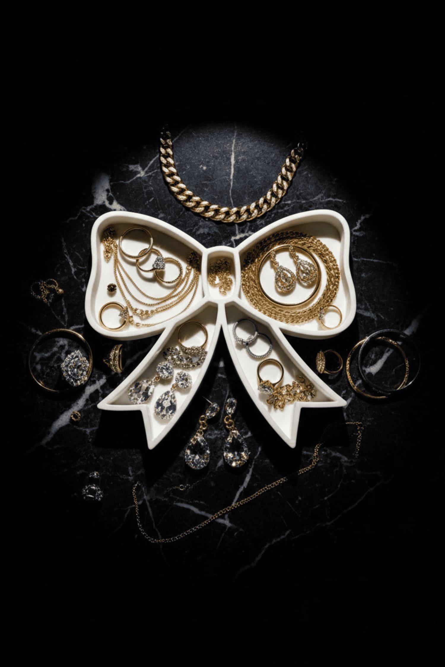 Prstani, verižice in uhani dobijo svoje mesto, hkrati pa ostanejo razporejeni pregledno in brez zapletanja. Pentlja simbolizira darilo – in prav tak občutek ustvari tudi v prostoru: nekaj posebnega, osebnega, lepega na pogled.