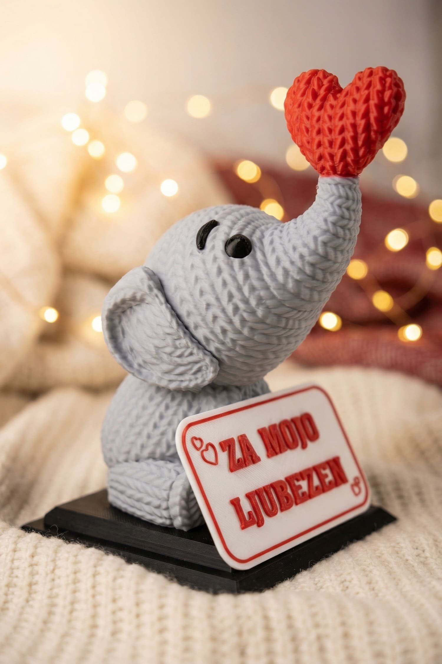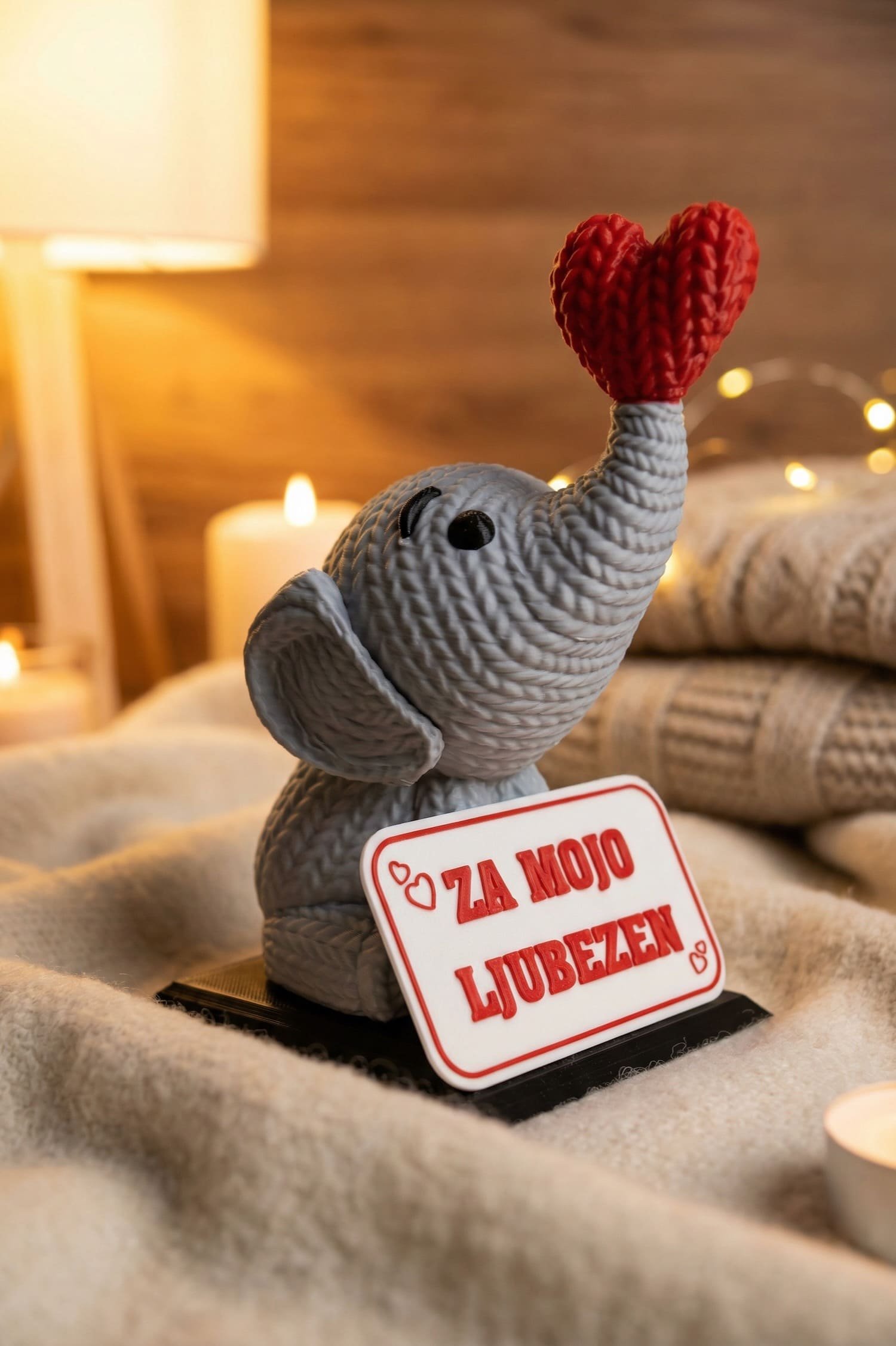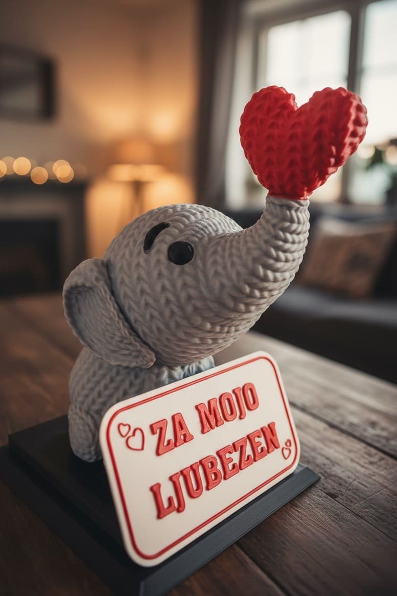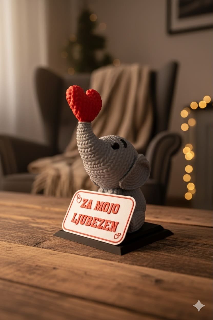 Slonček, ki v rilcu drži srček, kot da je zbral ves pogum, da pove nekaj lepega. Pred sabo ima tablico z besedilom, ki ga izbereš ti – tisto kratko sporočilo, ki pride naravnost do srca.