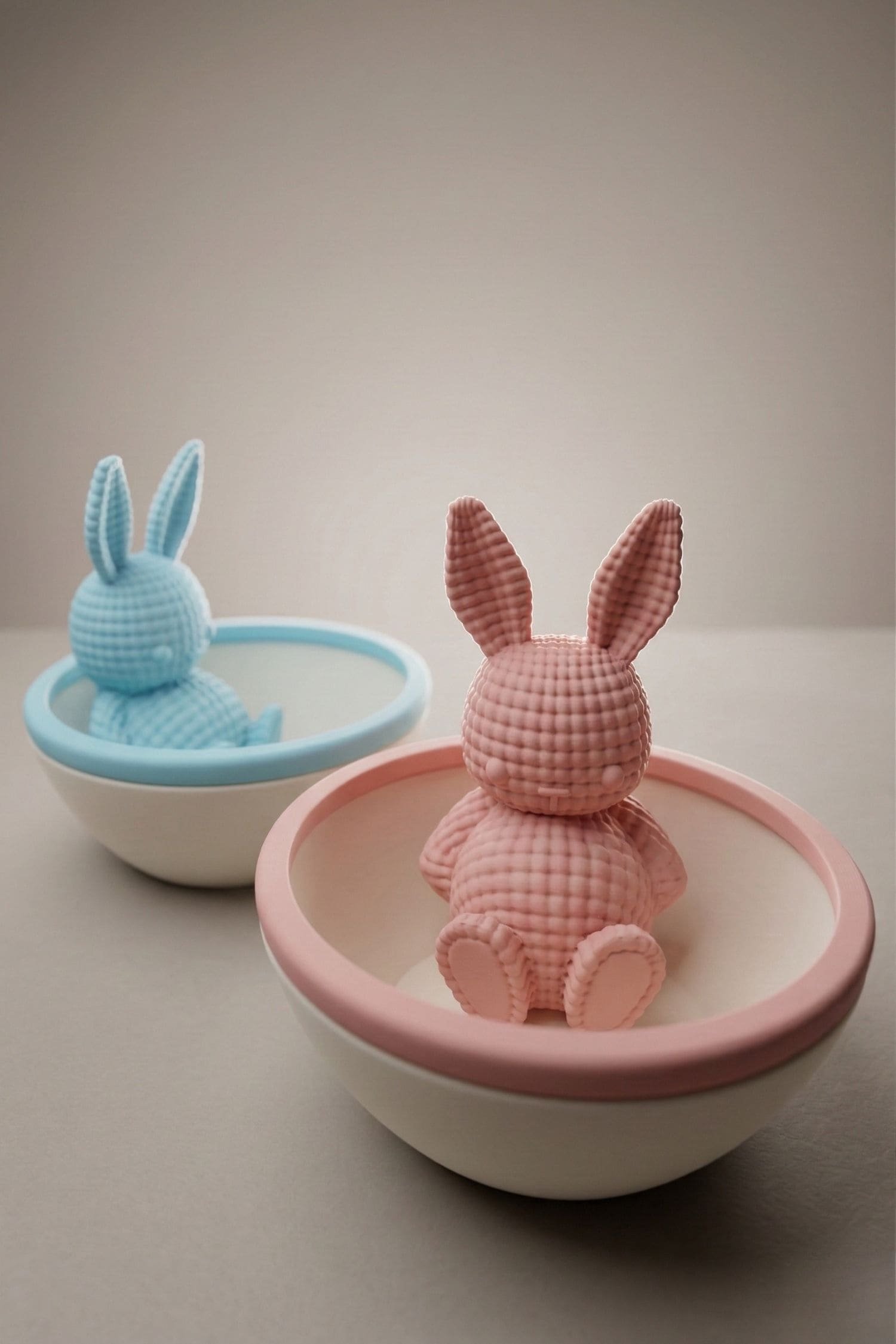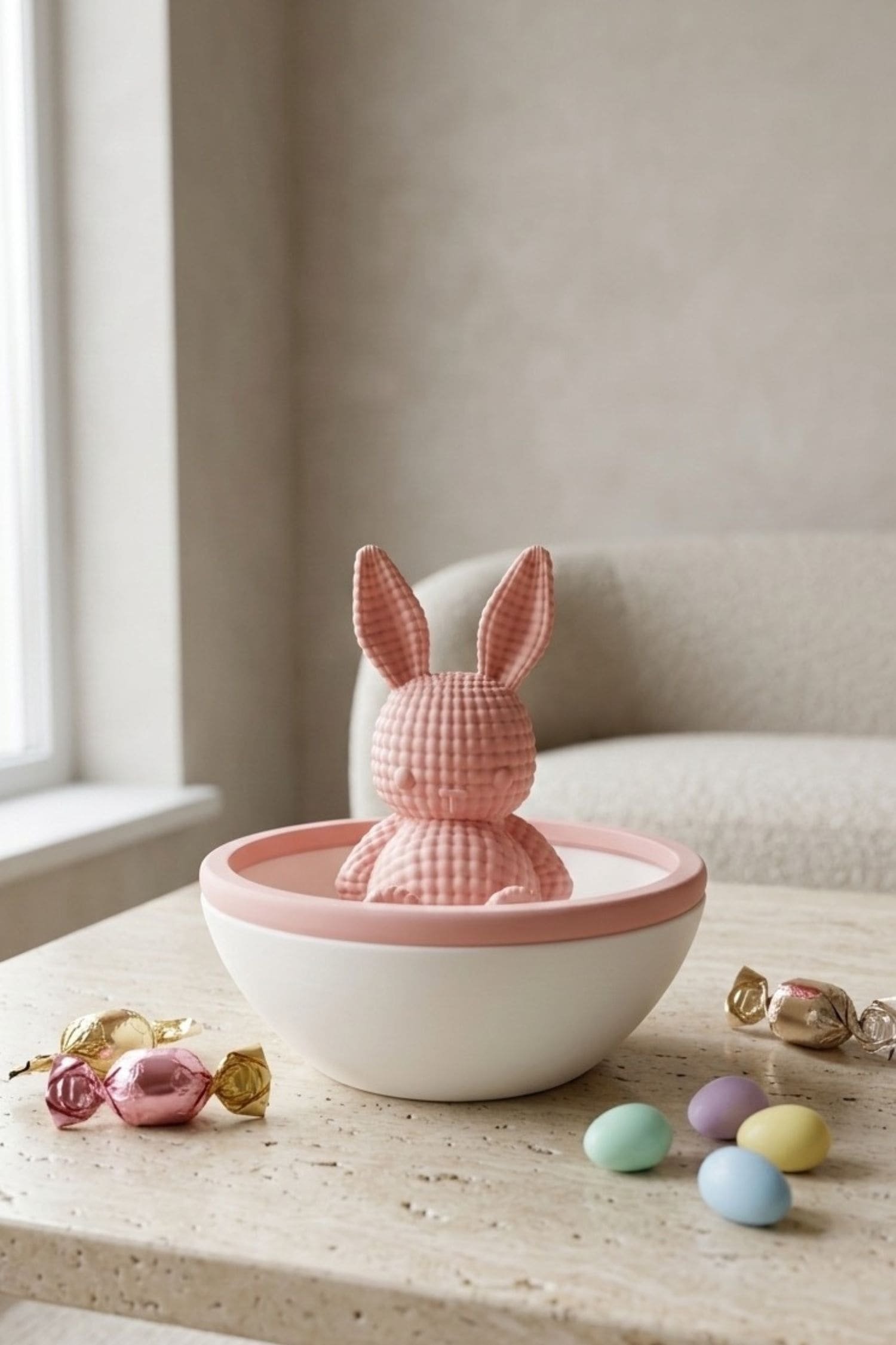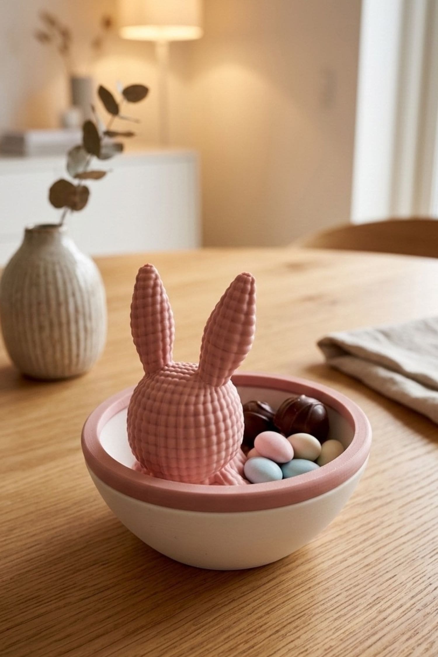 Zajček, ki sedi na robu posodice, daje izdelku poseben čar in občutek domačnosti. Posodica je popolna za sladkarije, majhne prigrizke ali drobne pozornosti, hkrati pa deluje kot lep dekor, ki pritegne pogled in ustvari prijetno vzdušje.