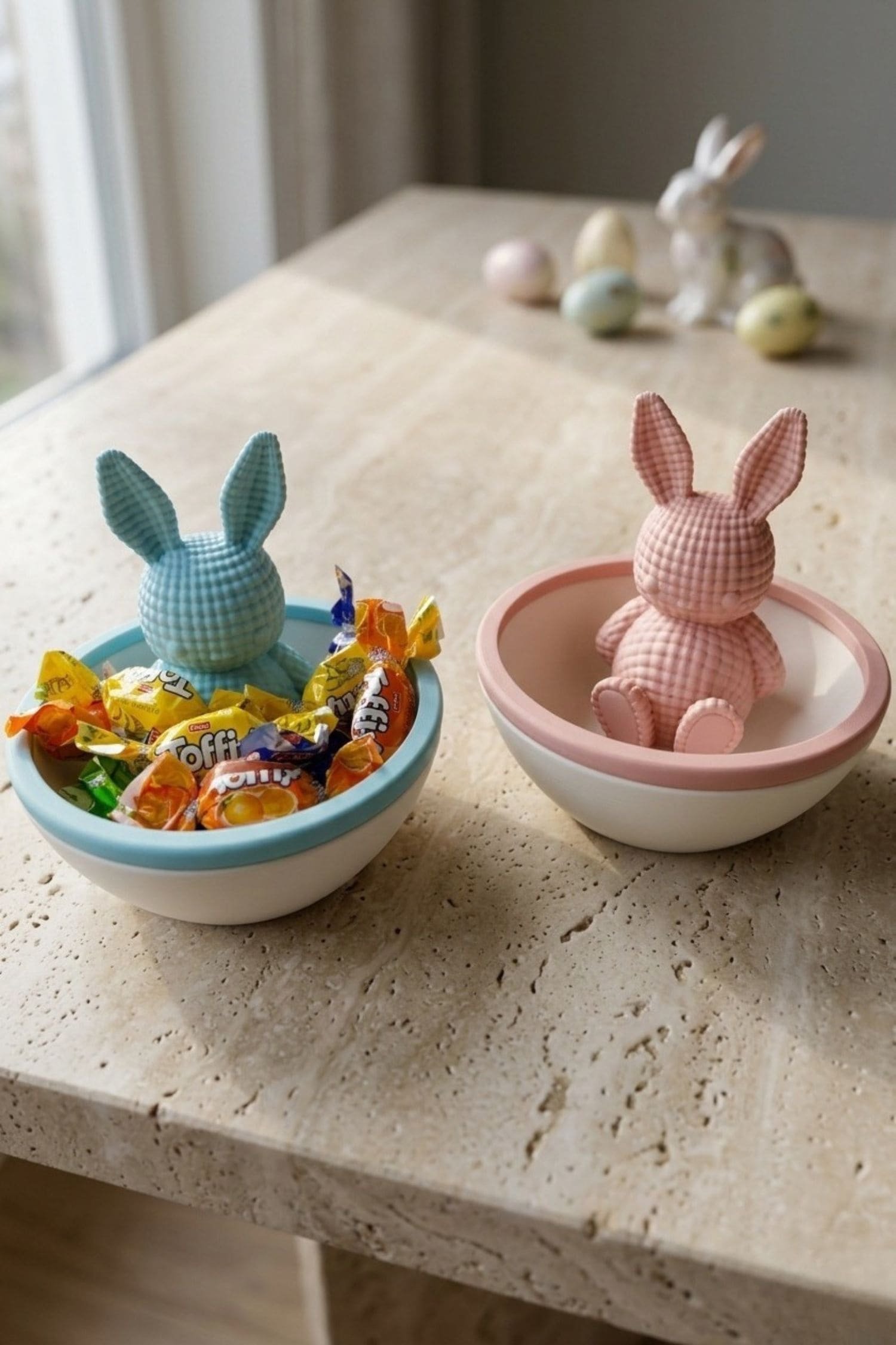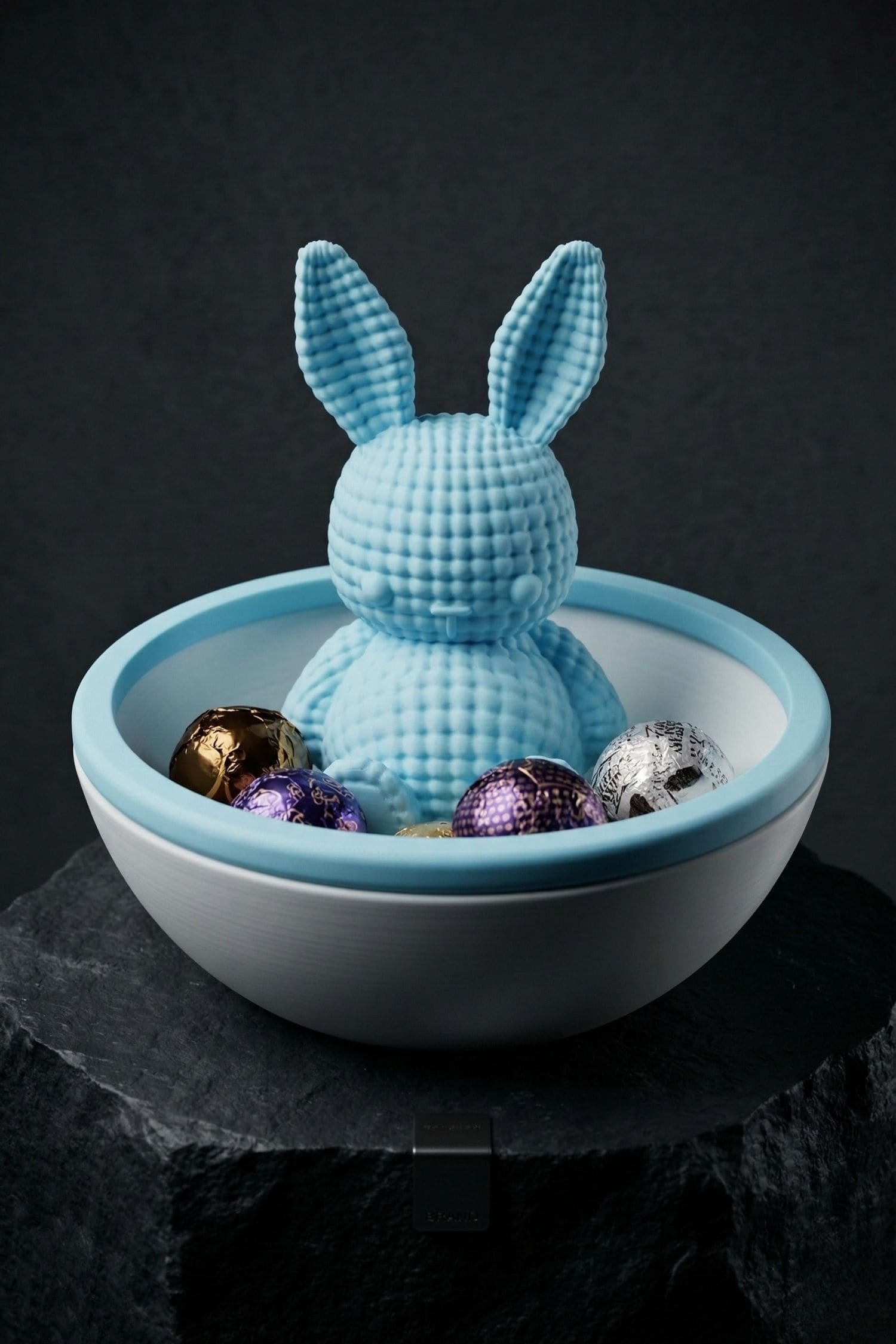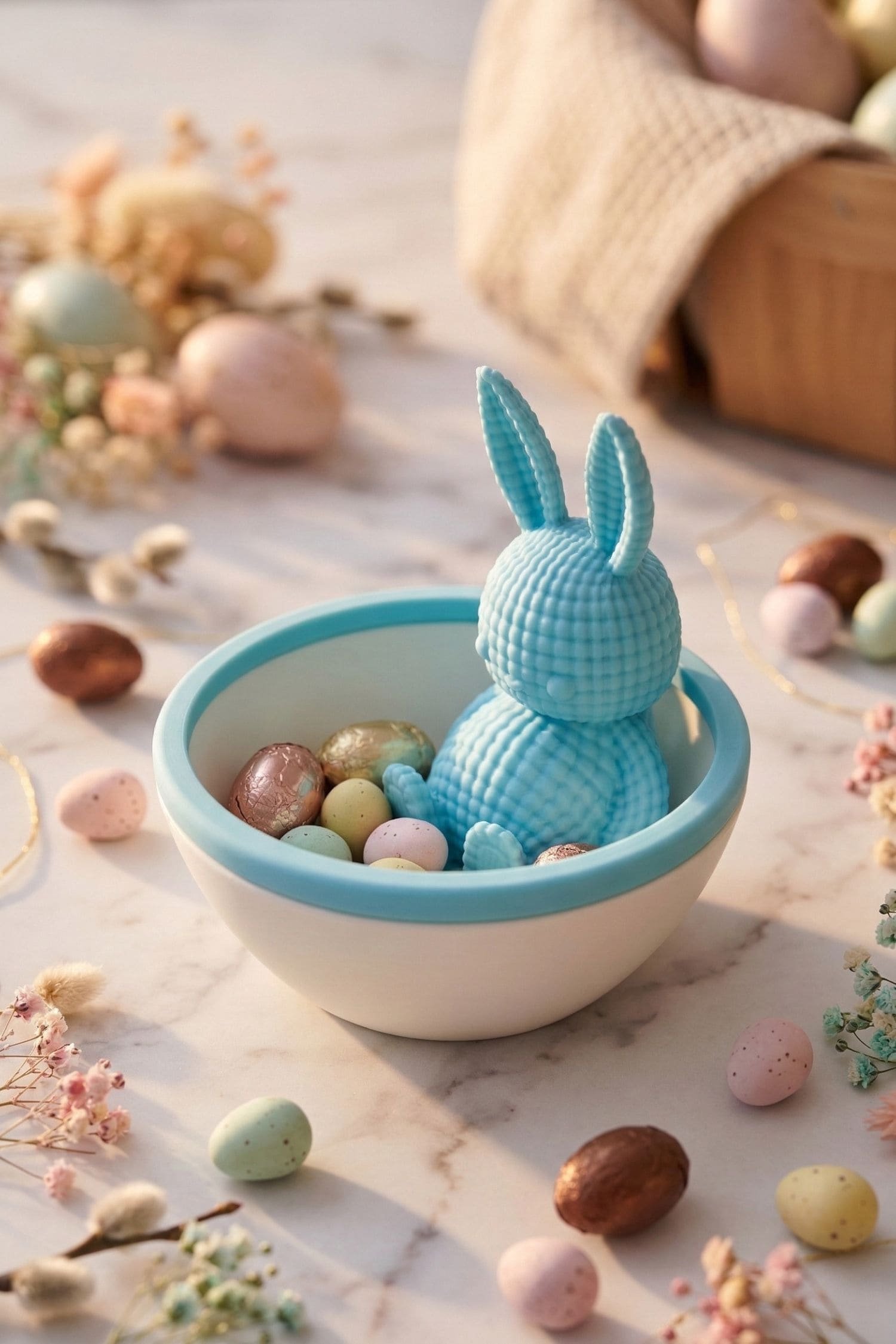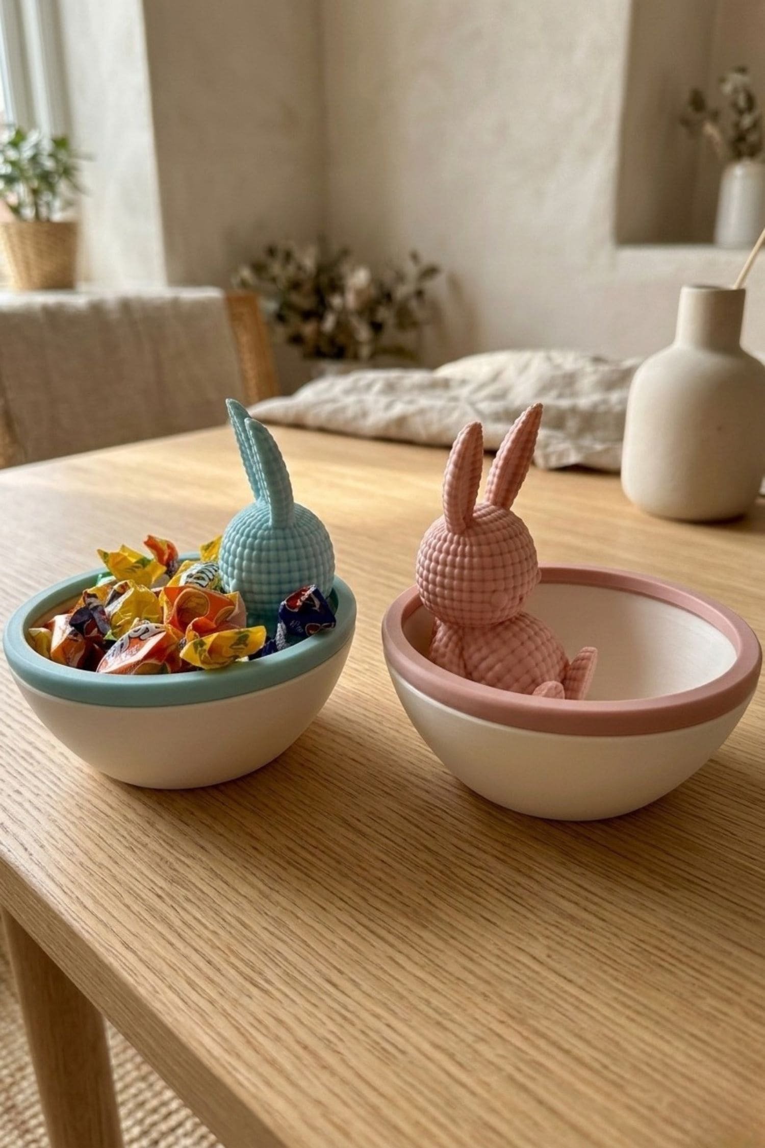 Zajček, ki sedi na robu posodice, daje izdelku poseben čar in občutek domačnosti. Posodica je popolna za sladkarije, majhne prigrizke ali drobne pozornosti, hkrati pa deluje kot lep dekor, ki pritegne pogled in ustvari prijetno vzdušje.